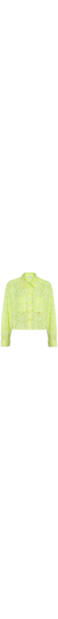 A camisa verde é confeccionada por laise sem elasticidade. A peça solta ao corpo possui colarinho simples, mangas longas com ajuste nos punhos, ombros levemente estendidos, bordados em cor neon, bolsos frontais com puxador de gorgurão, logo da marca aplicado na altura do busto, pequenas fendas laterais com detalhe em bordado na cor laranja, barra arredondada, recorte posterior, fechamento por botão frontal e comprimento cropped*.