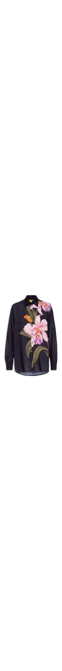 A camisa preta é confeccionada em tecido leve sem elasticidade. A peça solta ao corpo possui colarinho clássico, ombros estendidos, mangas longas com abotoamento nos punhos, recorte posterior, estampa floral em cores contrastantes na parte frontal, fendas laterais, barra mullet* arredondada, leve transparência, comprimento alongado e fechamento frontal em botões.