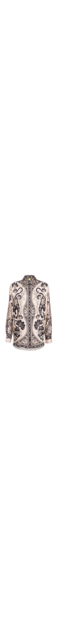 A camisa bege é confeccionada em tecido leve sem elasticidade. A peça solta ao corpo possui colarinho simples, mangas longas com abotoamento e pregas nos punhos, recorte posterior com pregas, mix de estampas em cores contrastantes, barra arredondada com fendas, comprimento alongado e fechamento frontal por botões.