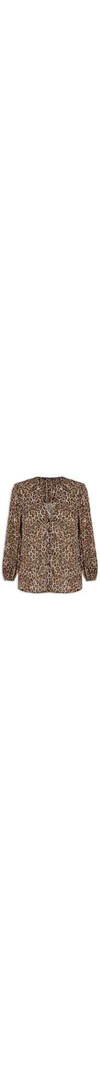 A camisa animal print é confeccionada em tecido leve com fios de lurex e sem elasticidade. A peça solta ao corpo possui decote V, colarinho padre, mangas 7/8 com elástico embutido na barra, recorte frontal e posterior com detalhe de viés e franzido, barra mullet* arredondada, transparência e fechamento frontal em botões.