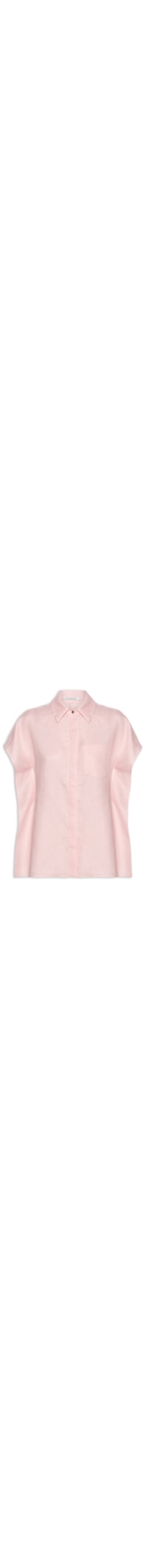 A camisa rosa é confeccionada em linho sem elasticidade. A peça solta ao corpo possui colarinho clássico, mangas curtas modelo japonesa, recortes laterais, bolso frontal, fendas laterais, fechamento frontal por botões com aba sobreposta.