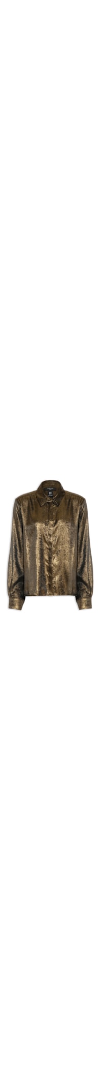 A camisa dourada é confeccionada em tecido leve com fios de lurex. A peça possui colarinho francês, mangas longas com abotoamento nos punhos, recorte posterior com tag metálica da marca aplicada, fendas laterais, barra mullet*, shape solto e fechamento frontal por botões.