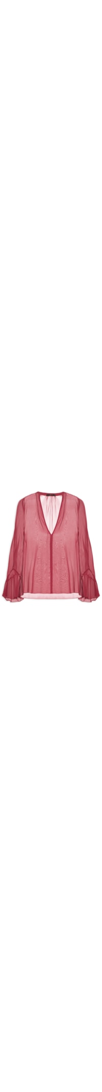 A camisa vermelha é confeccionada em tecido leve sem elasticidade. A peça solta ao corpo possui decote V profundo, mangas longas amplas, recorte frontal central e leve transparência.