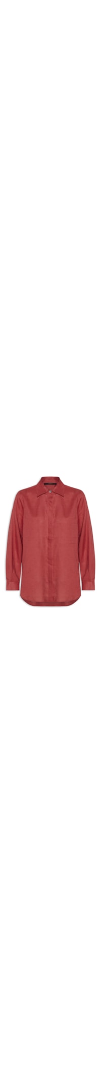 A camisa vermelha é confeccionada em linho sem elasticidade. A peça solta ao corpo possui colarinho clássico, mangas longas com abotoamento nos punhos, recorte posterior com pregas, bolsos na altura do busto, comprimento alongado e fechamento frontal por botões.