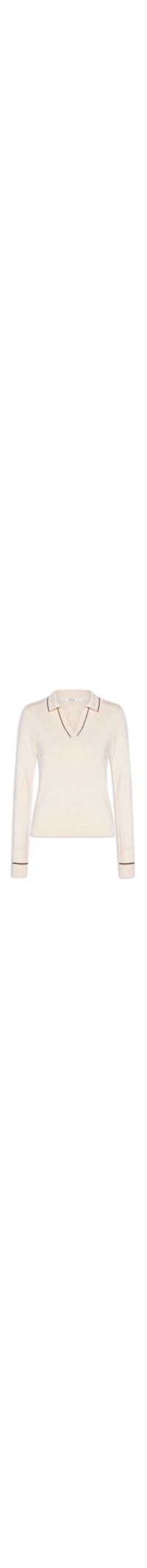A camisa branca é confeccionado em tricot com alta elasticidade A peça solta ao corpo possui gola esporte com esporte em V, mangas longas e acabamentos em vivo na cor marrom.