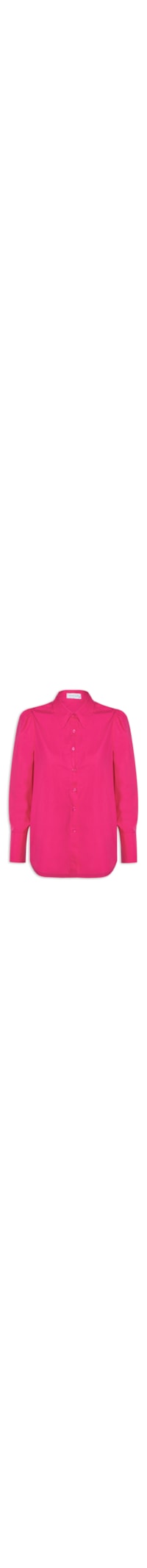 A camisa rosa é confeccionada em tecido leve sem elasticidade. A peça solta ao corpo, possui colarinho clássico, mangas longas com punho largo e abotoamento, ombros franzidos, barra mullet* arredondada e fechamento frontal por botões.