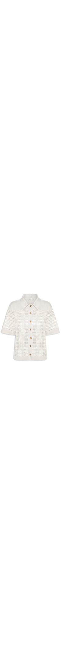 A camisa bege é confeccionada por tricot com média elasticidade. A peça solta ao corpo possui colarinho simples, mangas curtas, ombros estendidos, acabamento canelado no colarinho, barra, mangas e ombros, alta transparência e fechamento frontal por botões.