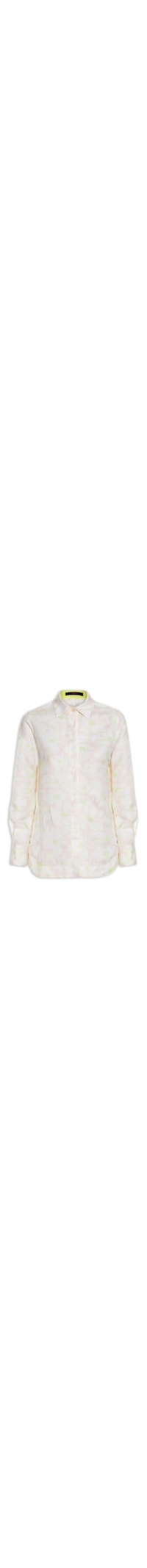 A camisa rosa é confeccionada em linho misto sem elasticidade. A peça solta ao corpo possui colarinho francês, mangas longas com abotoamento nos punhos, recorte pala posterior com prega, recorte lateral de faixa em tom neon, fendas laterais, barra arredondada, estampa floral em tom contrastante e fechamento frontal em botões com viés sobreposto.