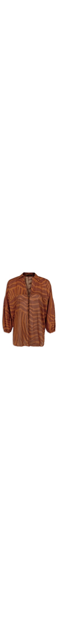 A camisa marrom é confeccionada em tecido leve e sem elasticidade. A peça solta ao corpo possui colarinho clássico, mangas longas com elástico nos punhos para ajuste, mix de estampas com cores contrastantes, recorte posterior, recortes frontais e posteriores e fechamento frontal por botões.