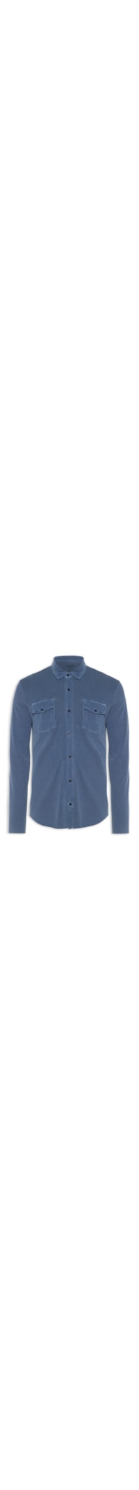 A camisa azul é confeccionada em sarja. A peça possui colarinho francês, mangas longas, bolsos frontais com fechamento por aba sobreposta e botões, recorte posterior, corte à fio na barra, shape solto, caimento reto e fechamento frontal por botões.
