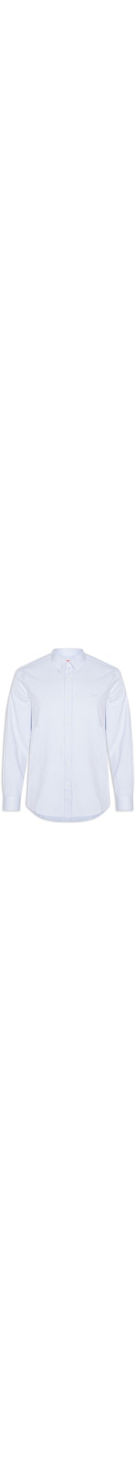 A camisa azul é confeccionada em malha de algodão sem elasticidade. A peça solta ao corpo possui colarinho clássico, mangas longas com punhos ajustáveis, logo da marca bordado na altura do tórax, recorte na parte posterior e fechamento frontal por botões.