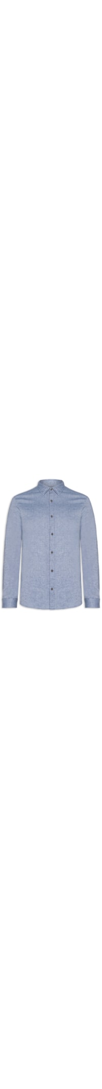 A camisa azul é confeccionada em malha de algodão sem elasticidade. A peça solta ao corpo possui colarinho clássico, mangas longas com botões, recorte posterior co prega, barra arredondada, acabamento pespontado e fechamento frontal por botões.