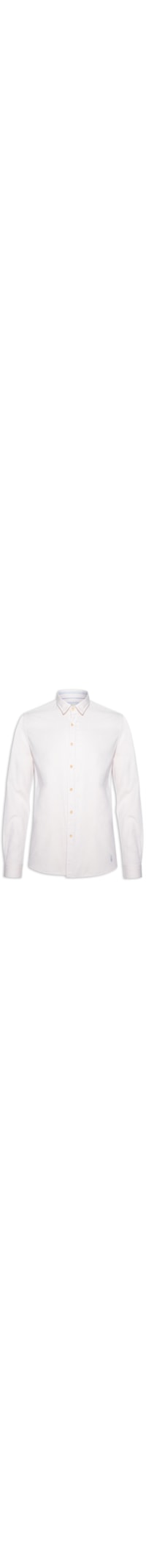 A camisa bege é confeccionada em tecido leve sem elasticidade. A peça solta ao corpo possui colarinho francês, mangas longas com abotoamento nos punhos, recorte posterior, logo da marca bordado na parte frontal em cor contrastante, barra arredondada e fechamento frontal por botões.
