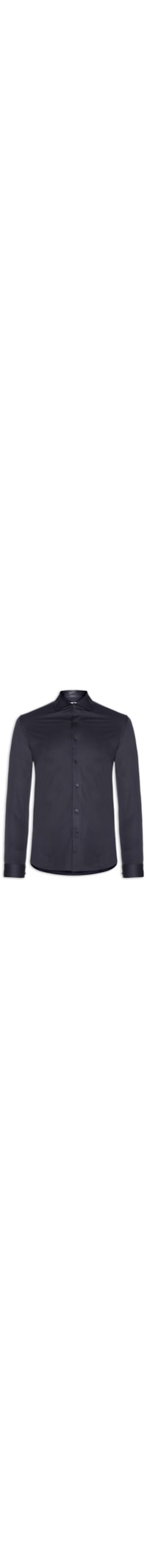 A camisa azul é confeccionada em tecido encorpado com toque acetinado e alta elasticidade. A peça de modelagem slim possui colarinho clássico, mangas longas com abotoamento nos punhos, barra arredondada e fechamento frontal por botões.