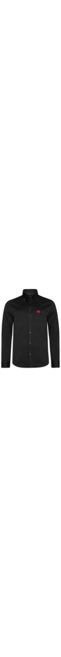A camisa preta é confeccionada em sarja sem elasticidade. A peça solta ao corpo possui colarinho francês, mangas longas com abotoamento nos punhos, recorte posterior com prega, bolsos frontais, tag da marca bordada no bolso frontal, barra arredondada e fechamento frontal por botões.