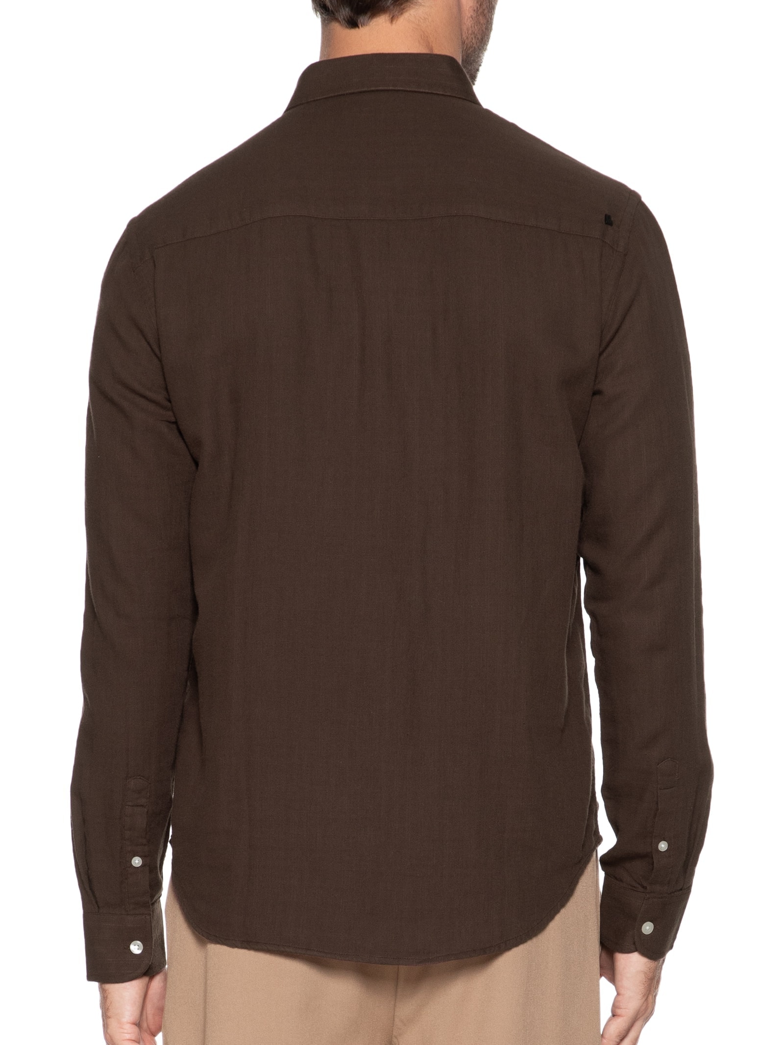 A camisa marrom é confeccionada em tecido leve sem elasticidade. A peça solta ao corpo possui colarinho francês, mangas longas com abotoamento nos punhos, recorte posterior, barra mullet* arredondada, bolso frontal na altura do tórax e fechamento frontal por botões.