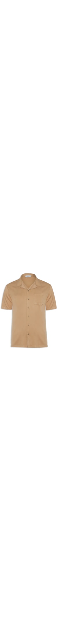 A camisa bege é confeccionada por tecido leve com baixa elasticidade. A peça solta ao corpo possui colarinho simples, mangas curtas, bolso frontal na altura do tórax, pequenas fendas laterais, recorte posterior e fechamento por botões frontais.