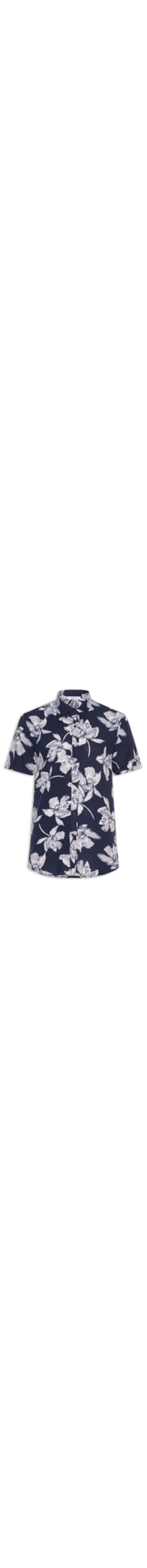 A camisa azul é confeccionada em tecido leve sem elasticidade. A peça solta ao corpo possui colarinho clássico, mangas curtas, recorte posterior, padronagem floral em cor contrastante e fechamento frontal por botões.