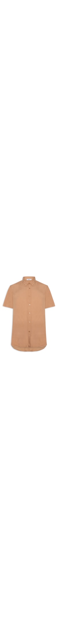A camisa marrom é confeccionada em tecido leve sem elasticidade. A peça solta ao corpo possui colarinho simples, mangas curtas e fechamento frontal por botões.