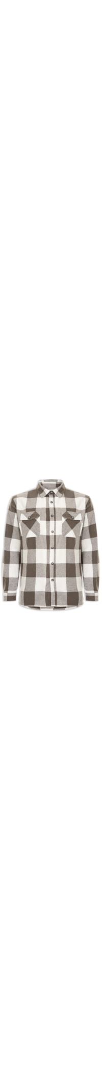 A camisa marrom é confeccionada em malha leve sem elasticidade. A peça solta ao corpo possui colarinho francês, mangas longas com abotoamento nos punhos, recorte posterior, bolsos frontais com aba sobreposta e fechamento por botão, barra arredondada, padronagem xadrez em cor contrastante e fechamento frontal por botões.