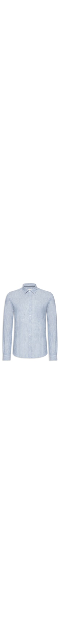A camisa azul é confeccionada em linho sem elasticidade. A peça possui colarinho clássico, mangas longas com abotoamento nos punhos, bolso frontal aplicado na altura do tórax, recorte posterior com tag resinada da marca aplicada em cor contrastante, padronagem com fios em tons contrastantes, barra arredondada e fechamento frontal em botões.