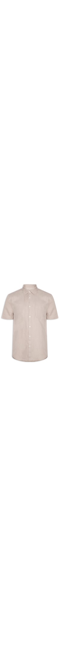A camisa bege é confeccionada linho sem elasticidade. A peça solta ao corpo possui colarinho clássico, mangas curtas, bolso frontal embutido, pregas posteriores e fechamento frontal por botões.