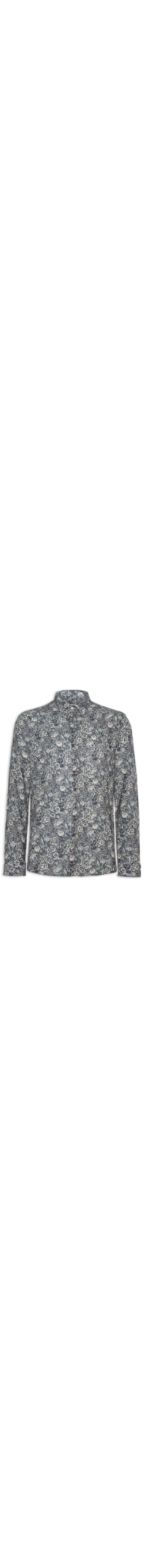 A camisa azul marinho é confeccionada em tecido leve sem elasticidade. A peça solta ao corpo possui colarinho clássico, mangas longas com abotoamento nos punhos, mix de estampas em cor contrastantes, barra arredondada e fechamento frontal por botões com vista sobreposta.