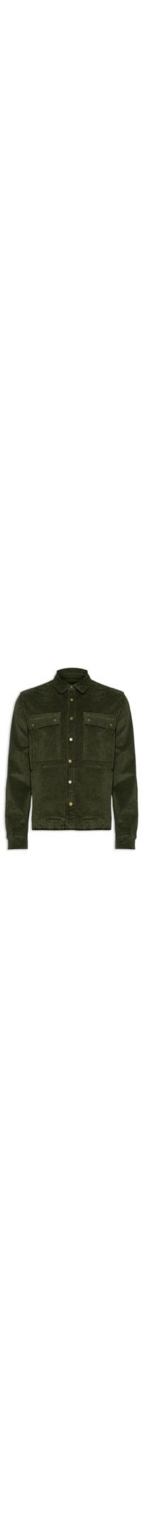 A camisa verde é confeccionada em tecido encorpado sem elasticidade. A peça solta ao corpo possui colarinho francês, mangas longas com abotoamento nos punhos, recorte posterior, bolsos frontais com fechamento por aba e botão na altura do tórax, fendas laterais e fechamento frontal por botões.