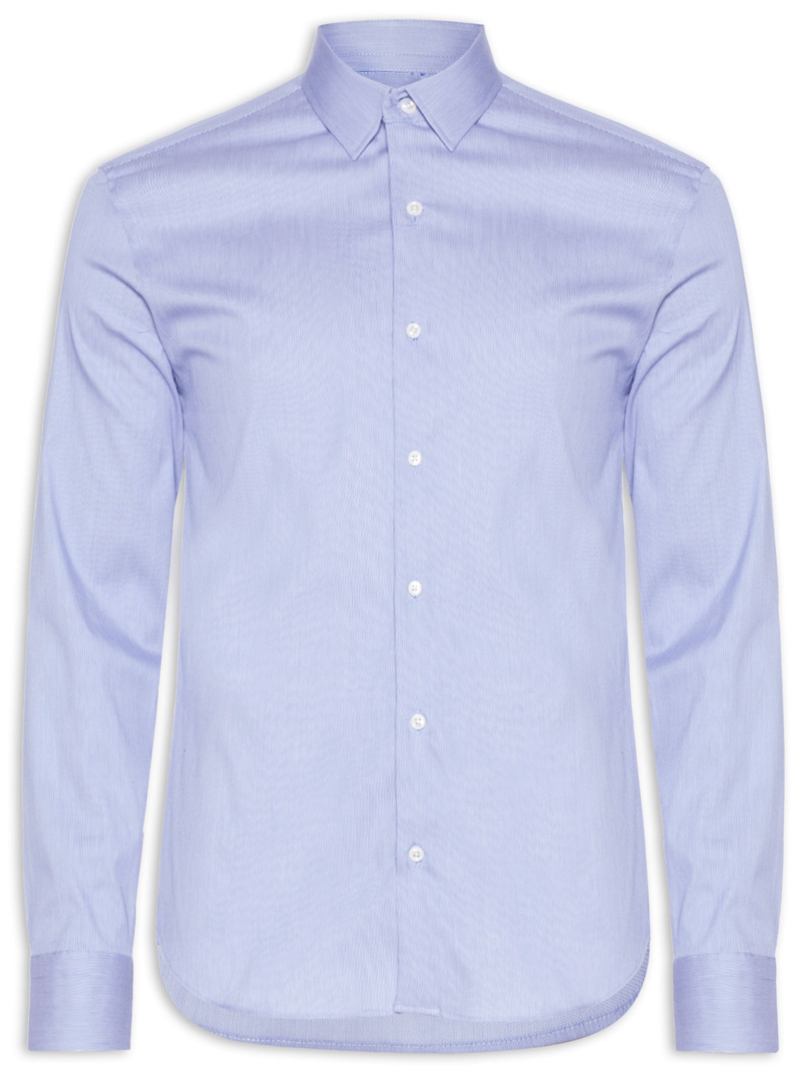 A camisa azul é confeccionada em tecido leve com média elasticidade. A peça possui colarinho clássico, mangas longas com abotoamento nos punhos, recorte posterior, barra arredondada e fechamento frontal por botões.