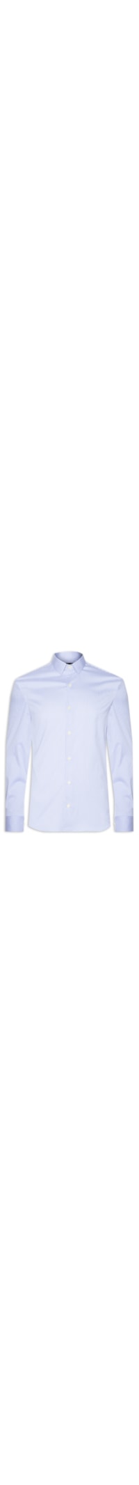 A camisa azul é confeccionada em tecido leve sem elasticidade. A peça solta ao corpo possui colarinho clássico, mangas longas com abotoamento nos punhos, recorte posterior, padronagem listrada na cor branca, barra arredondada e fechamento frontal por botões.