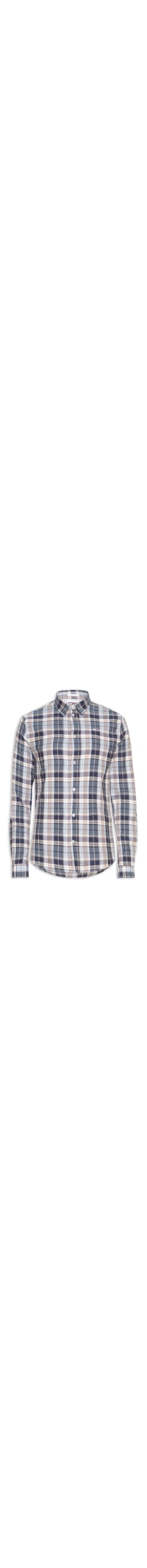 A camisa azul é confeccionada em tecido leve sem elasticidade. A peça solta ao corpo possui colarinho americano, mangas longas com abotoamento nos punhos, padronagem xadrez em cores contrastantes, logo da marca bordado na parte frontal na área do tórax em cores contrastantes, barra arredondada e fechamento frontal por botões.