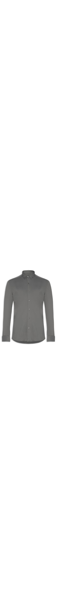 A camisa cinza é confeccionada em malha de poliamida com alta elasticidade. A peça solta ao corpo possui colarinho clássico, mangas longas com abotoamento nos punhos, recorte posterior, barra mullet* arredondada e fechamento frontal por botões.