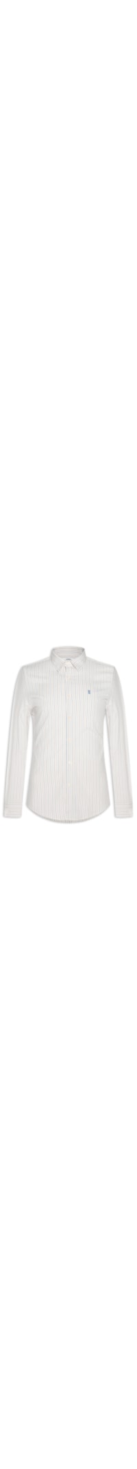 A camisa azul é confeccionada em tecido leve com baixa elasticidade. A peça solta ao corpo possui colarinho clássico, mangas longas com ajuste nos punhos, logo da marca bordada na parte frontal e padronagem de listras na cor branca.