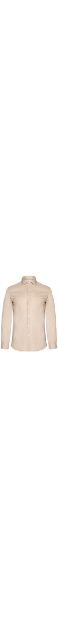 A camisa bege é confeccionada em linho misto sem elasticidade. A peça solta ao corpo possui colarinho clássico, mangas longas com ajuste nos punhos, barra arredondada e fechamento frontal por botões.