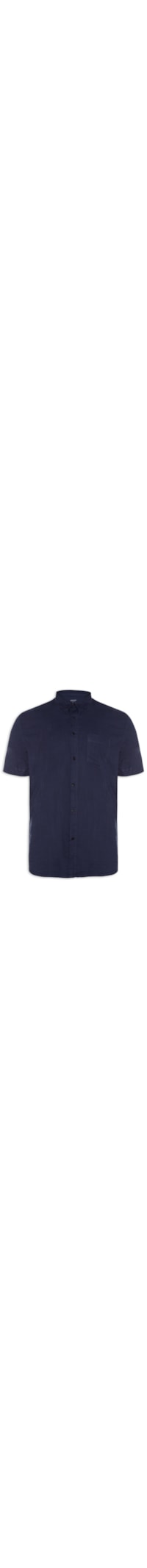 A camisa azul marinho é confeccionada em tecido leve. A peça solta ao corpo possui colarinho simples, mangas curtas, recorte posterior com detalhe de pregas, barra arredondada e fechamento frontal por botões.