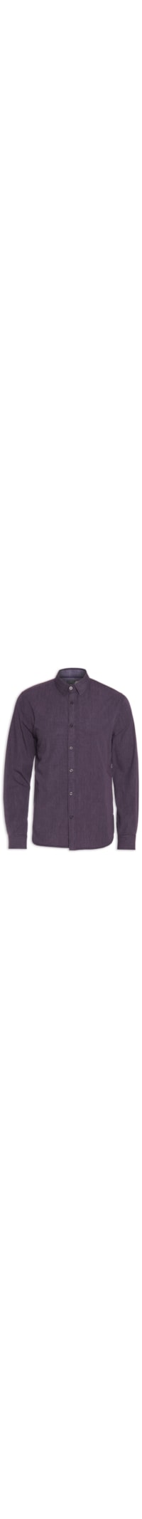 A camisa roxa é confeccionada em tricoline. A peça possui colarinho francês, mangas longas com botões aplicados nos punhos, tag da marca aplicada no punho, recorte posterior, padronagem de mini listras, caimento reto, shape solto, acabamento pespontado e fechamento frontal por botões.