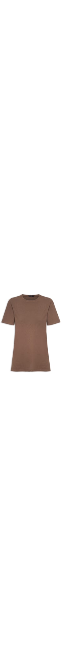 A camiseta marrom é confeccionada por malha de algodão com média elasticidade. A peça solta ao corpo de modelo ampla possui decote redondo com acabamento canelado, mangas curtas, ombros estendidos e comprimento alongado.