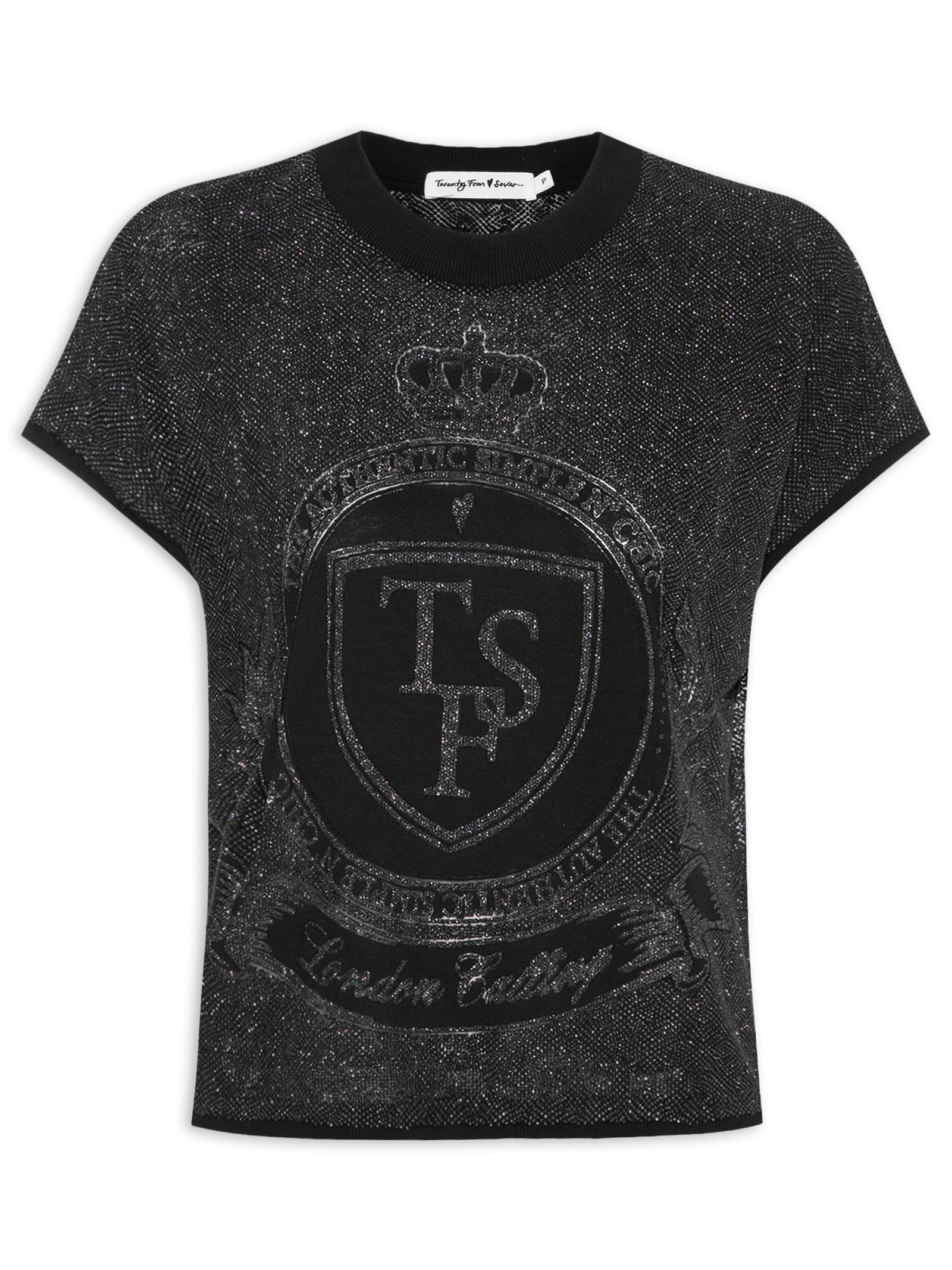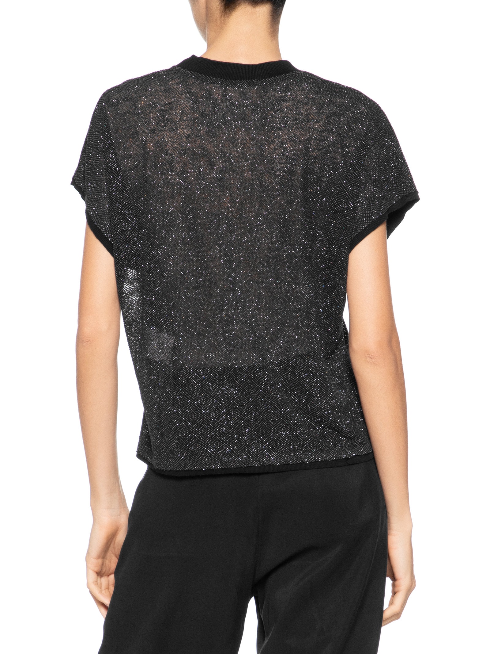 A camiseta preta é confeccionada em malha leve com superfície em pedrarias e baixa elasticidade. A peça solta ao corpo possui decote redondo, mangas curtas japonesa, leve transparência, mix de estampa em pedrarias na parte frontal e acabamento canelado nos punhos, decote e barra.