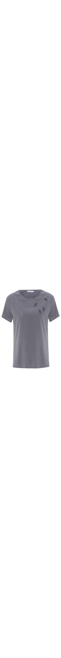 A camiseta cinza é confeccionada em malha. A peça solta ao corpo possui decote redondo, mangas curtas e bordados figurativos de pássaros na cor preto na parte frontal e na manga esquerda.