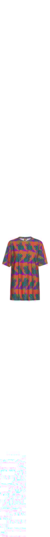 A camiseta vermelha é confeccionada em malha de algodão com baixa elasticidade. A peça solta ao corpo de modelo oversized* possui decote redondo com acabamento canelado, mangas curtas, cavas estendidas e estampa figurativa em tons contrastantes.