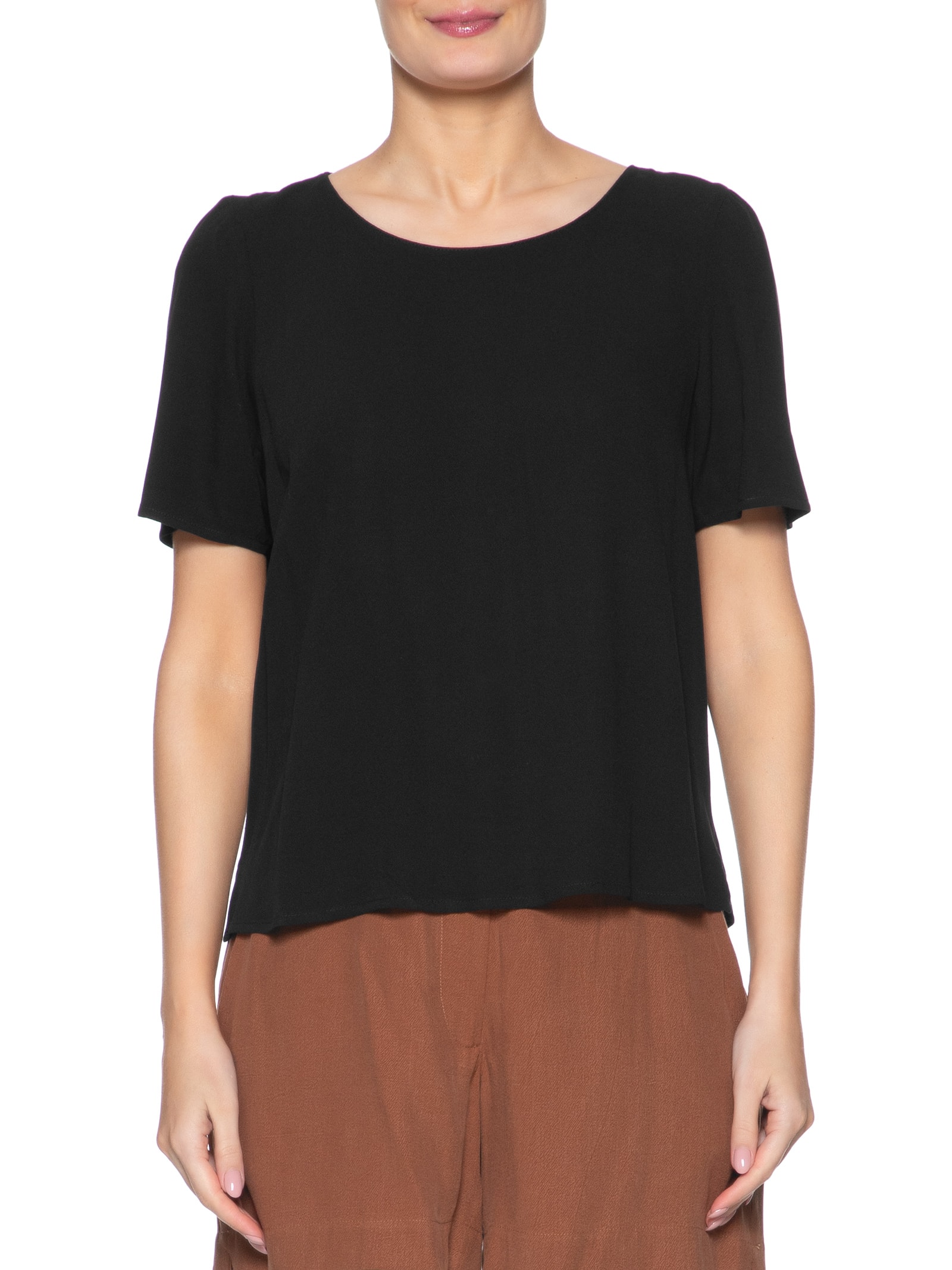 A camiseta preta é confeccionada em tecido leve sem elasticidade. A peça solta ao corpo possui decote redondo, mangas curtas, fendas laterais curtas e fechamento posterior por botão em recorte vazado.