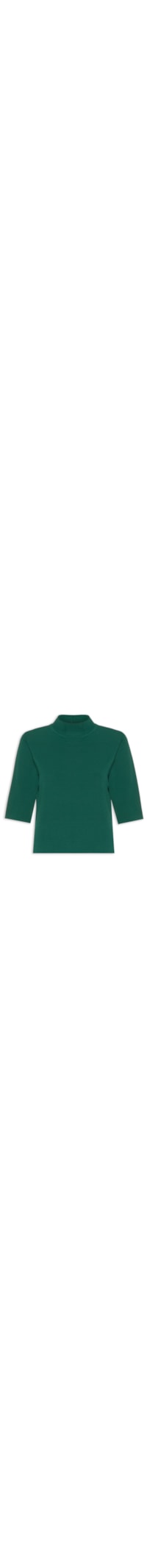 A camiseta verde é confeccionada em tricot de média elasticidade. A peça solta ao corpo, possui gola alta com acabamento canelado, mangas curtas e fendas laterais.