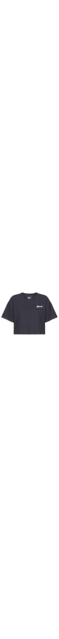 A camiseta preta é confeccionada em malha de algodão com média elasticidade. A peça solta ao corpo possui decote arredondado com acabamento canelado, mangas curtas, logo da marca aplicado em cor contrastante na altura do busto e comprimento cropped*.