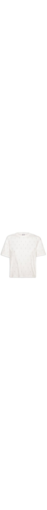A camiseta off white é confeccionada em malha de algodão com média elasticidade. A peça solta ao corpo possui decote redondo com acabamento canelado, mangas curtas, ombros estendidos, tag da marca aplicada em metal na parte posterior na altura do decote e aplicações de strass.