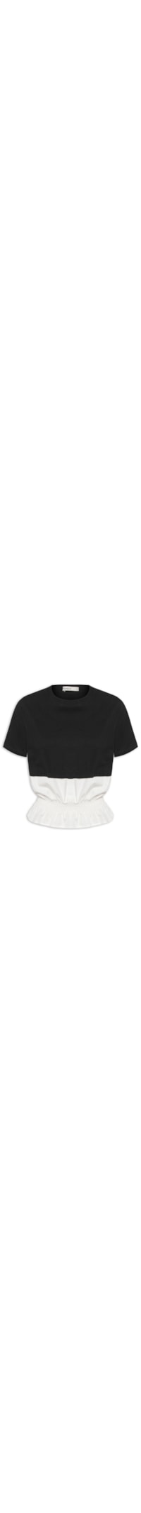 A camiseta preta é confeccionada em malha de algodão com média elasticidade. A peça solta ao corpo possui decote redondo com acabamento canelado, mangas curtas e recorte na altura da cintura em tecido leve de cor off white com lastex aplicado.
