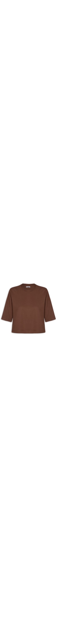 A camiseta marrom é confeccionada em malha de algodão com baixa elasticidade. A peça solta ao corpo possui decote arredondado com acabamento canelado, mangas curtas e comprimento cropped*.