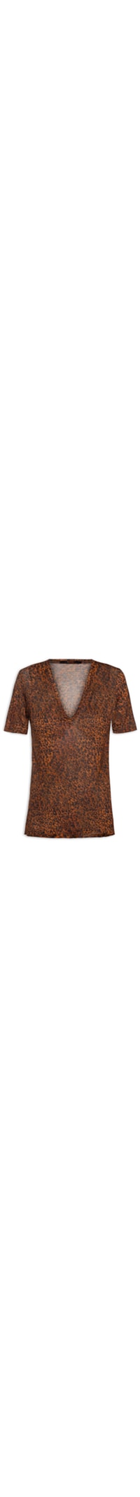 A camiseta animal print é confeccionada em tecido leve de média elasticidade. A peça solta ao corpo possui decote V, mangas curtas e leve transparência.