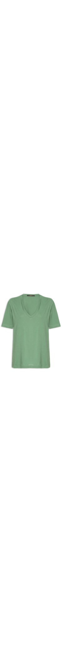 A camiseta verde é confeccionada em malha de algodão pima com média elasticidade. A peça solta ao corpo possui decote V, mangas curtas e leve transparência.
