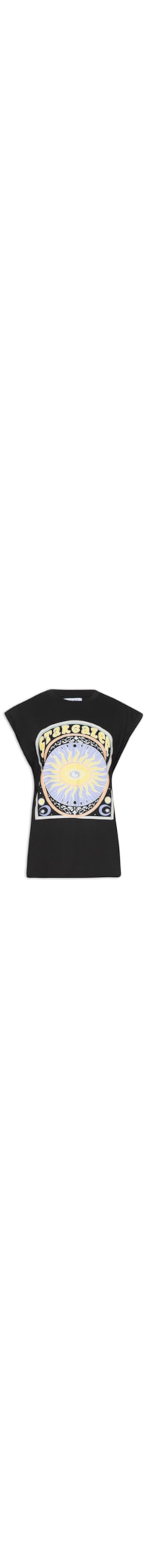 A camiseta preta é confeccionada em malha de algodão com elasticidade média. A peça solta ao corpo possui gola careca, cavas estendidas, estampa localizada e ombros estendidos:
