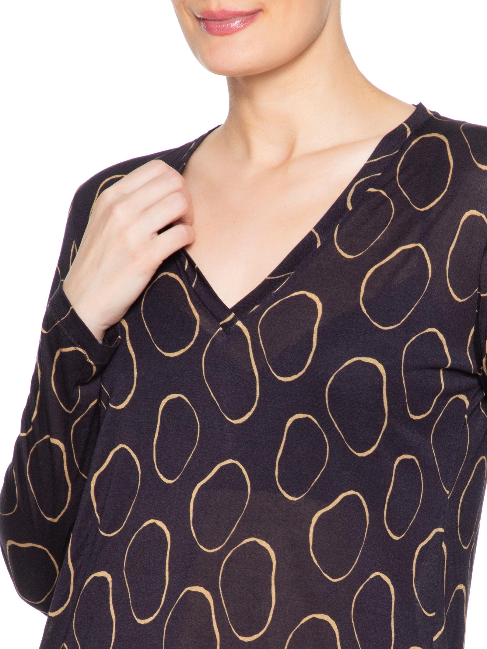 A camiseta preta é confeccionada em malha com alta elasticidade. A peça solta ao corpo possui decote V, mangas longas e estampa abstrata na cor bege.